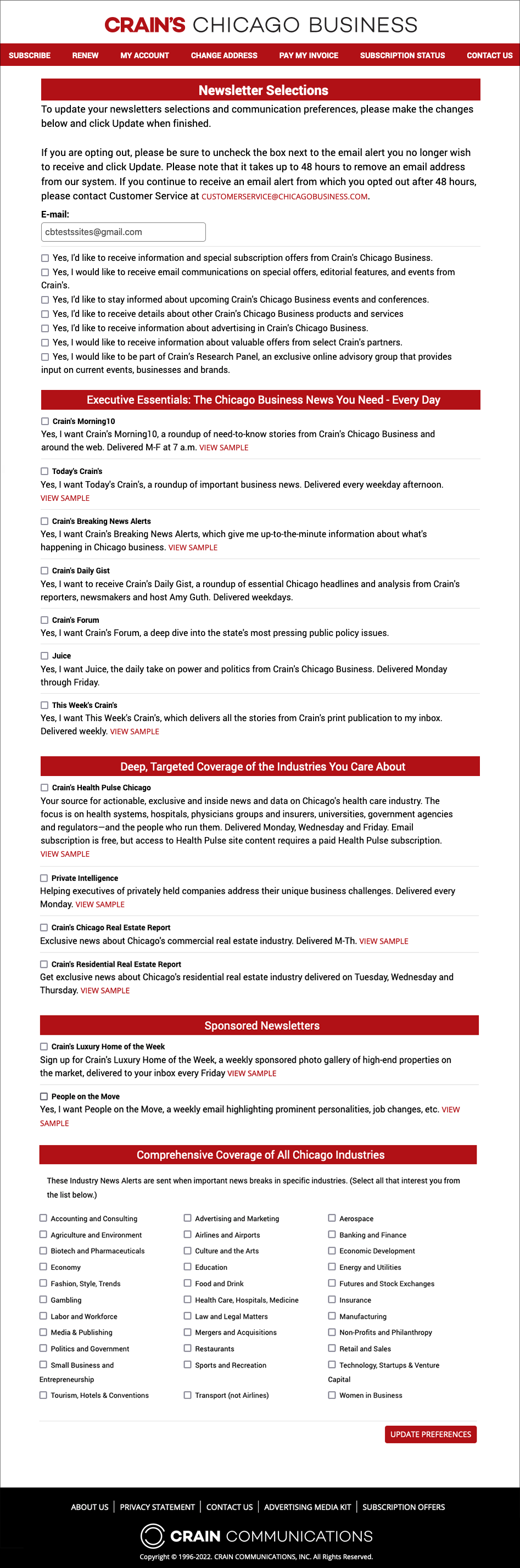 Current state: There are 53 check boxes within the newsletter sign up page. Visual/information and choice overload.